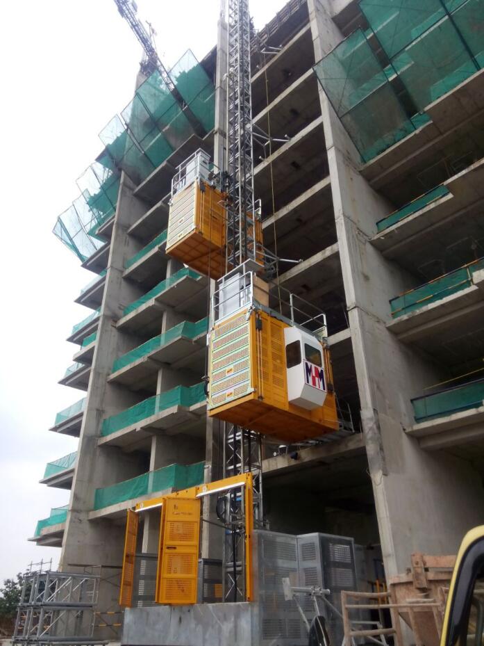 該工程項目采用我公司生產的三種型號施工升降機:1、SC200/200E施工升降機;2、SC200/200GBG變頻高速施工升降機,運行速度為0~60m/min;3、SC200/200GBZ變頻中速施工升降機,運行速度為0~46m